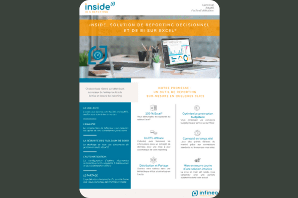 INSIDE Reporting, logiciel édité par INFINEO, permet à tout utilisateur d’Excel® de se connecter à l’ensemble des données financières, commerciales et RH de l’Entreprise et de produire un reporting de qualité.